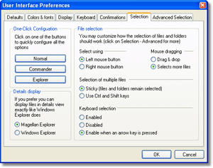The file selection method in Magellan Explorer is completely customizable. You may use left or right mouse button, sticky multiple files selection or