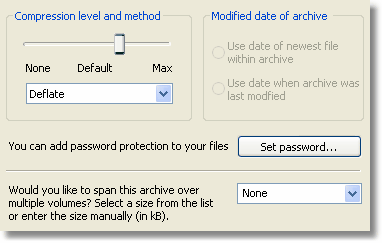 By clicking the options button the dialog is expanded to also include the dialog portion shown below. This lets you configure advanced options for this archive, such as the compression level and method, password protection and other options. Please note that some alternatives are only available for certain archive formats. Continue the tour. |