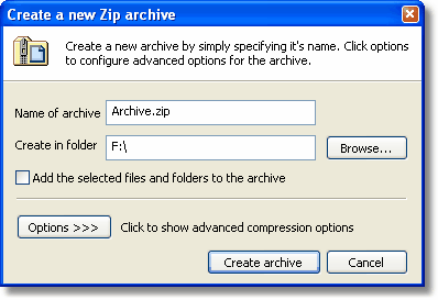 Displayed below is the dialog used to create new archives. By default only the most commonly used options, as seen in the first screen shot, are displayed. They give you the choice of where to place the archive, what to name it and whether or not to automatically add any selected files. Continue the tour. |