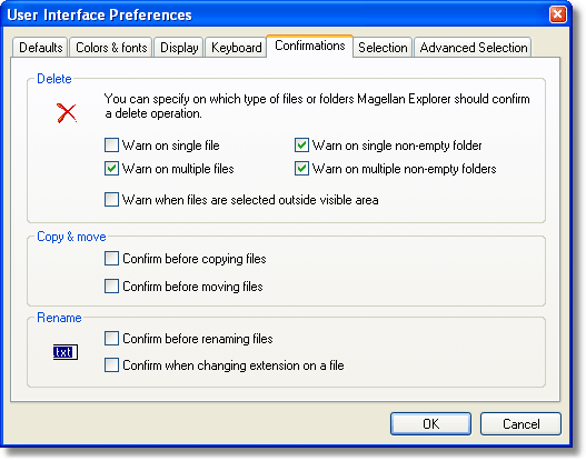 To prevent you from doing the wrong thing, Magellan Explorer can be configured to ask for confirmations before certain operations. Especially file deletion can be dangerous and you can therefore configure exactly when to be alerted before an operation is carried out, to prevent you from accidentally deleting the incorrect files. Continue the tour. |