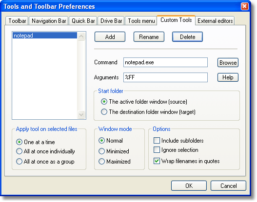 The custom tools configuration dialog is shown below. It lets you expand the feature set of Magellan Explorer by adding your own tools that execute external applications. You can include the current folder and file selection in the arguments as well as deciding whether to pass all arguments in one go or execute the application once for each file. Continue the tour. |