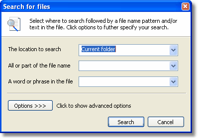 The find dialog shown below provides an easy to use, yet powerful means of locating files on your computer. By default, the find dialog opens as shown in the first screen shot. Here you can specify either a file name pattern (standard wild cards and regular expression can be used), a text pattern (regular expressions allowed, see below) or both. Continue the tour. |