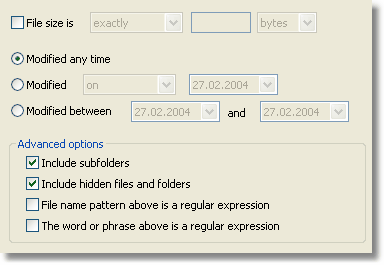 Clicking on the options button will expand the dialog to include the section shown below. Here you can chose to filter on file size, modified time stamp as well as some other options. As mentioned above, you can use regular expressions. However, when you do you must also check the appropriate box in the section below. Continue the tour. |