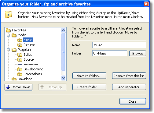 The image below shows the organize favorites dialog, which lets you reposition all your favorites in the tree structure. You can also edit your existing favorites from this dialog. Continue the tour. |