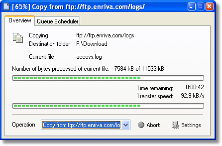 The images below demonstrate the power of the Magellan Explorer operation scheduling. The first image shows the overview page in the progress dialog. This is the page which shows you general progress information during file operations. If you have multiple operations ongoing you can select which to view from the Operation drop down box. Continue the tour. |