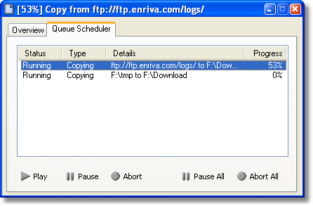 The second dialog shows the queue scheduler. If you have multiple operations ongoing or queued you will see them listed here. From this dialog you can choose to pause or abort individual operations, as well as monitor the progress of each operation. Continue the tour. |