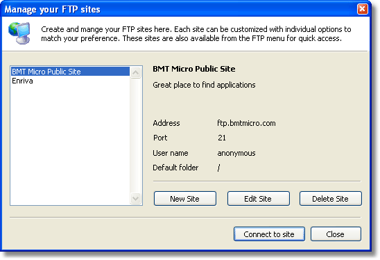 The main window in the site manager dialog is shown below. It lets you organize your favorite FTP sites, assign different options to each as well as connecting to the sites. The FTP sites listed in the site manager are also available directly from the FTP menu to provide easy access. Continue the tour. |
