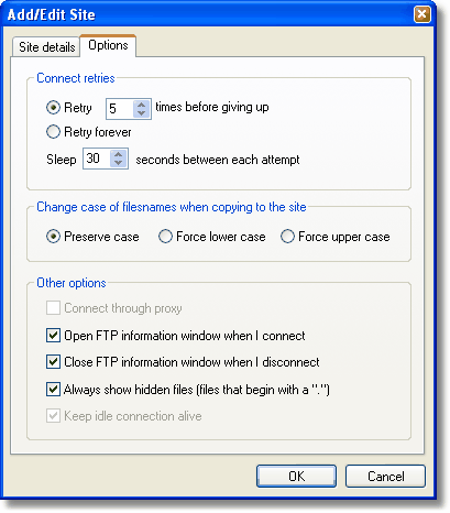 The dialog shown below is the per site options dialog. You can specify a range of options per site, as can be seen from the image. Continue the tour. |