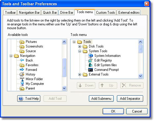 Just like all the tool bars, the tools menu can be completely customized. The screen shot below shows the dialog for configuring the tools menu. You can create sub menus and place tools (built-in tools, folder locations or custom tools) anywhere you like. Continue the tour. |